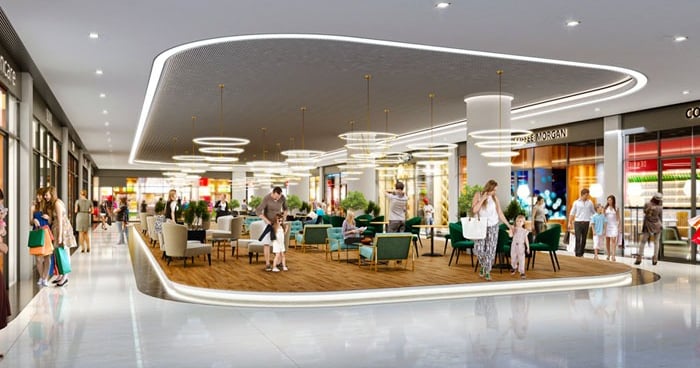 Integrated specialized systems for the cinema complex (acoustic wall/ceiling treatments, stadium seating foundations) and food court (extensive exhaust ventilation, grease management, and utility connections for each vendor).